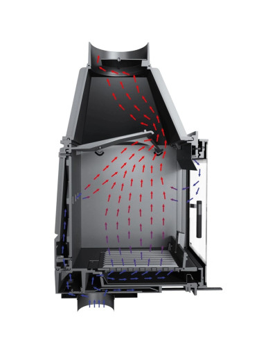 Focar cu randament ridicat, datorita conului inalt si a sistemului cu tripla combustie, cu aer preincalzit, ce imbunatateste procesul de ardere al lemnului. Aerul secundar este alimentat prin gaurile amplasate pe peretele din spate al acestuia, creand astfel sistemul de combustie.